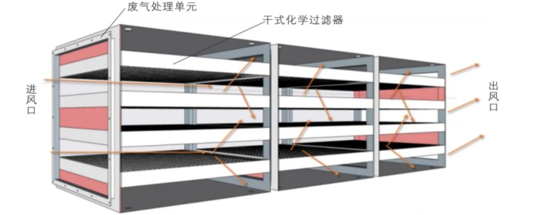 干式化學過濾器采用改性化學吸附的綜合工藝處理,其基本原理為:將設施排風口排出的廢氣導入設備,通過改性化學吸附段進行中和或氧化反應處理后并吸附其生成的中性鹽,徹底清除目標污染物。
